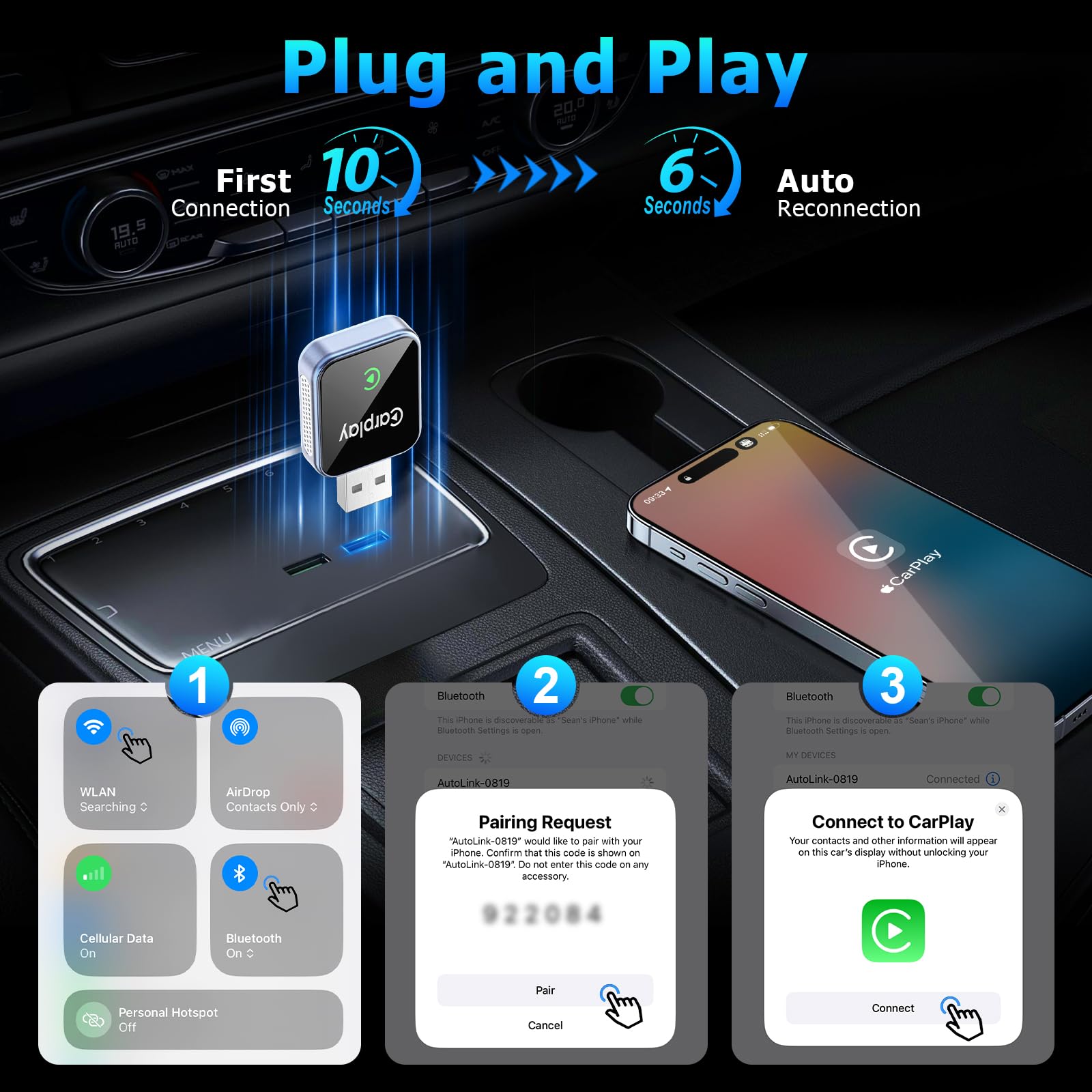 - 【Plug & Play, Auto-Reconnect】Set up in just three simple steps to turn wired CarPlay into wireless. Once paired, this USB wireless CarPlay adapter reconnects automatically every time you start your car, no repeated setup needed. No more tangled cables, just smooth wireless CarPlay for a cleaner dashboard and a hassle-free daily drive.